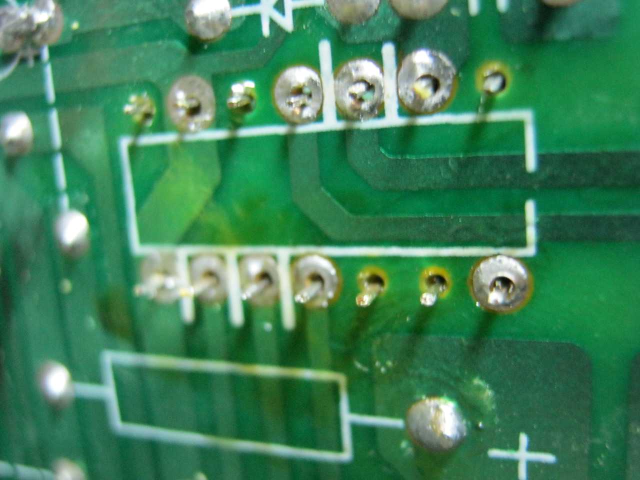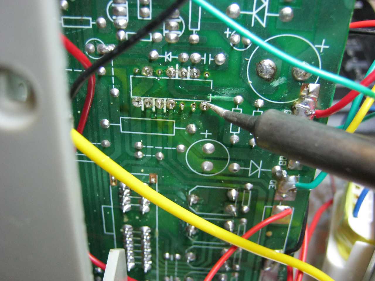 Ну что же, надо отпаять микросхему, для этого используем наш оловоотсос. На фото вид платы снизу микросхемы.