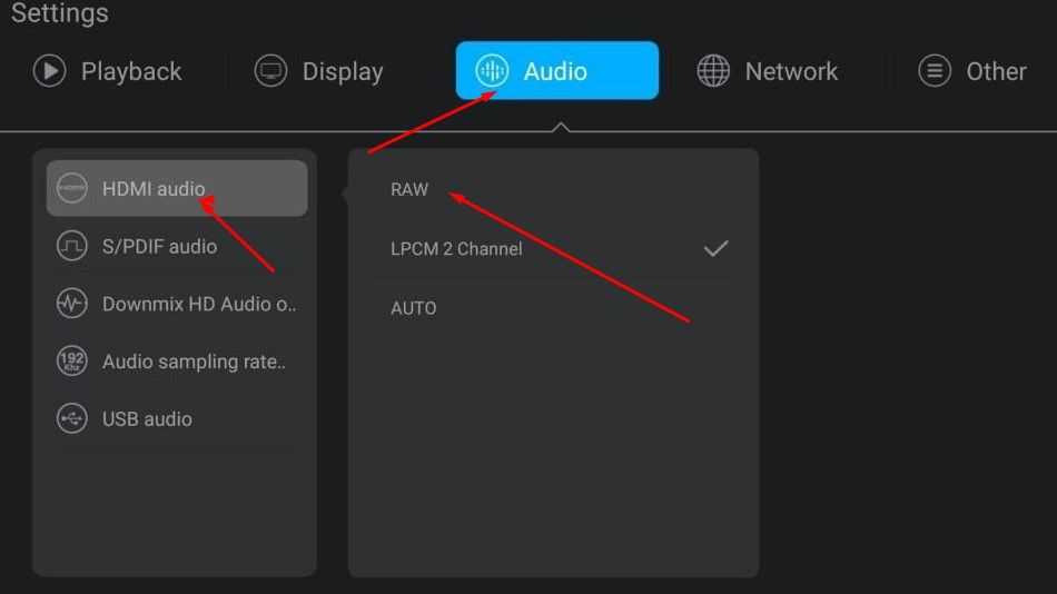 Если ТВ приставка и телевизор работают с кодеками Долби Диджитал, проще всего активировать опцию HDMI RAW в разделе настроек и смотреть видео без необходимости конвертации. Для этого в меню устройства выставьте следующие параметры: