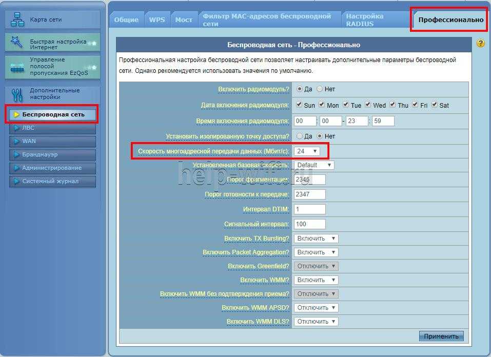 - Откройте вкладку «Профессионально». В пункте «Скорость многоадресной передачи данных» выставьте значение 24.