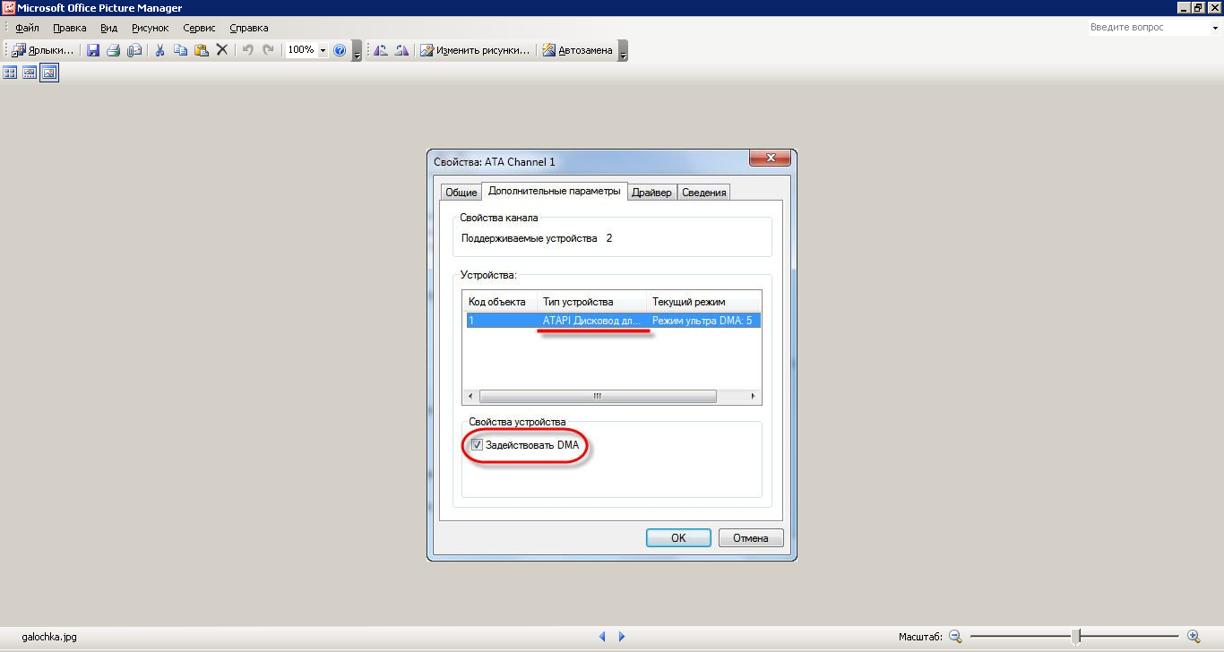 Сразу же в Диспетчере устройств зайдите в раздел IDE ATA/ATAPI контроллеры и раскройте его. Перед вами откроются пункты ATA channel 0, ATA channel 1 и ряд подобных. Кликните по каждому ПКМ, выберите свойства и зайдите в дополнительные параметры. В том случае, если там будет выбран ваш привод, то установите галочку на пункте “Задействовать DMA”. Выполните ребут системы, для внесения изменений.