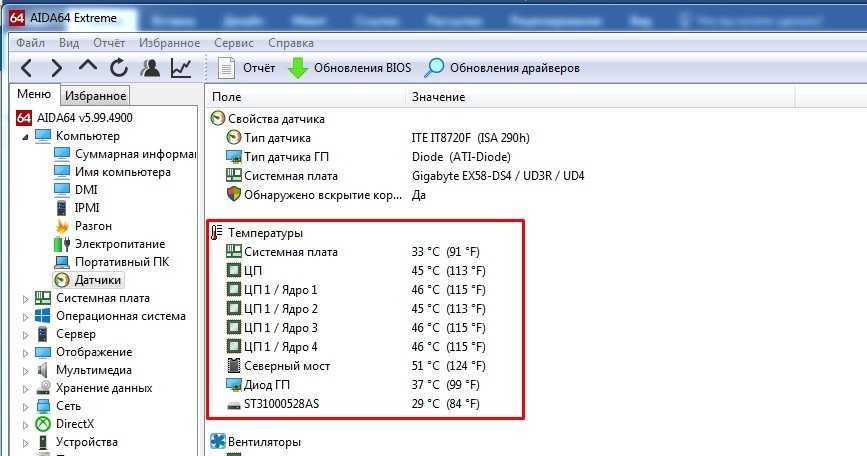 В разделе «Компьютер» подраздела «Датчики» находим информацию о температуре компонентов
