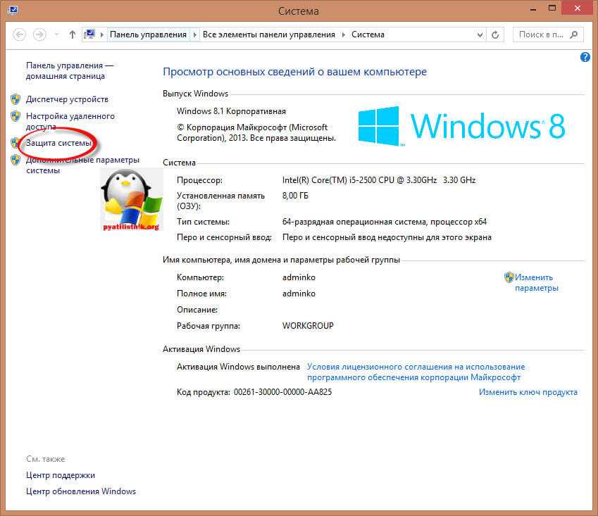 В открывшемся окне свойств слева выбираем «Защита системы».