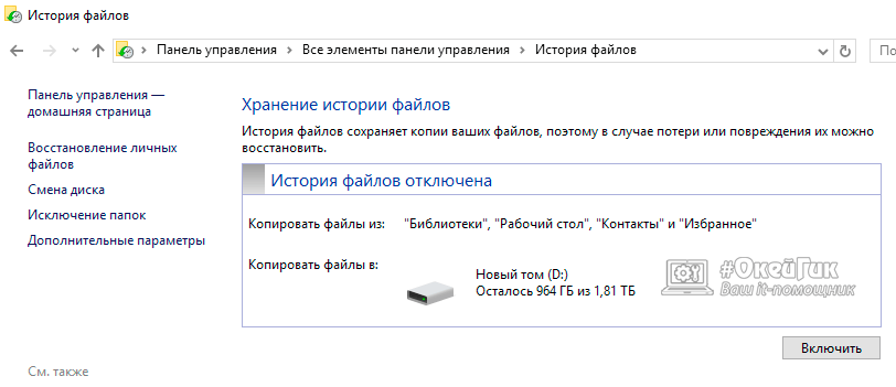 Кликните по кнопке Отключить, и тогда операционная система больше не будет автоматически создавать копии файлов и загромождать дисковое пространство. Возможно у вас по умолчанию история и так была отключена, тогда ничего не изменяем.
