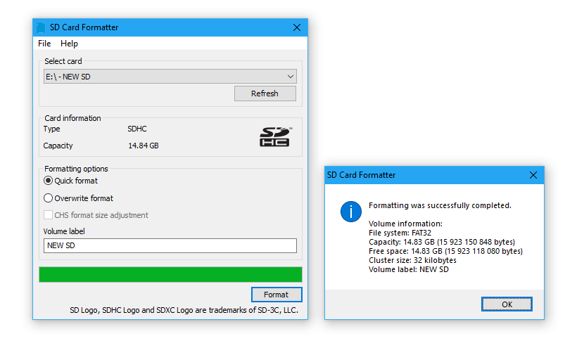 Утилита SDFormat поддерживает для типа форматирования флешек: Full OverWrite и Quick. Quick — поверхностное форматирование, которое только помечает документы в памяти носителя, как доступные для перезаписи; Full OverWrite — удаляет содержимое файлов с записью поверх нулей (пустоты).