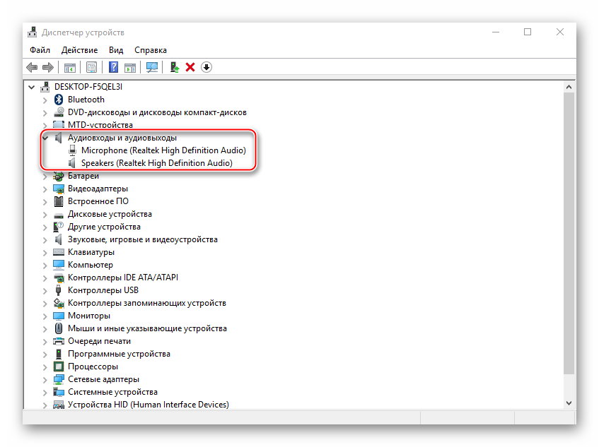 В «Диспетчере устройств» ищите пункт «Аудиовход и аудиовыходы» и разворачиваете его. Он у вас может называться несколько по-другому.