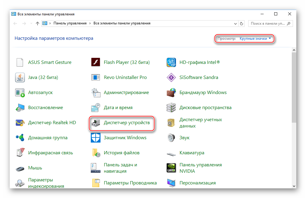 - Далее, чтобы было удобнее ориентироваться, рекомендуется поставить режим отображения на «Маленькие значки» или «Крупные значки». В доступном списке нужно выбрать «Диспетчер устройств».