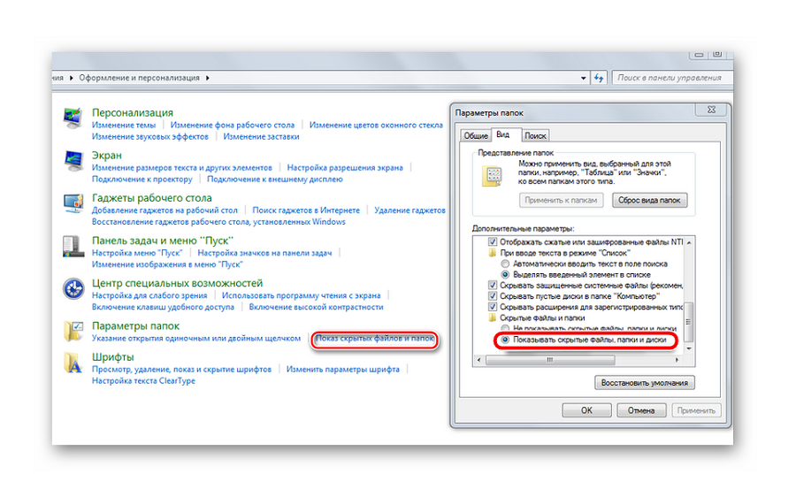 - Далее зайдите в раздел «Параметры папок» пункт «Показ скрытых файлов и папок».