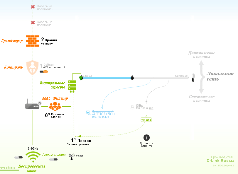 Как и у большинства новых моделей маршрутизаторов серии «DIR», первым пунктом web-интерфейса идёт вкладка «Monitoring» (Мониторинг), где представлена интерактивная схема подключения роутера.