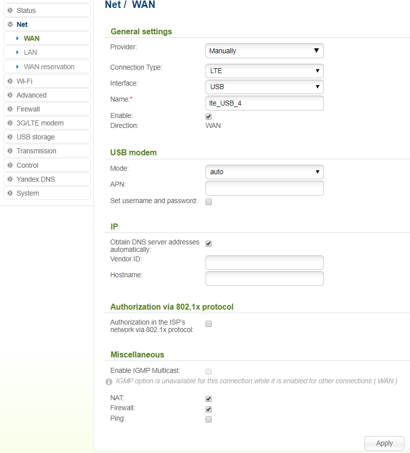 Для создания нового интернет-соединения откройте раздел меню «Net» (Сеть) — подраздел «WAN»: