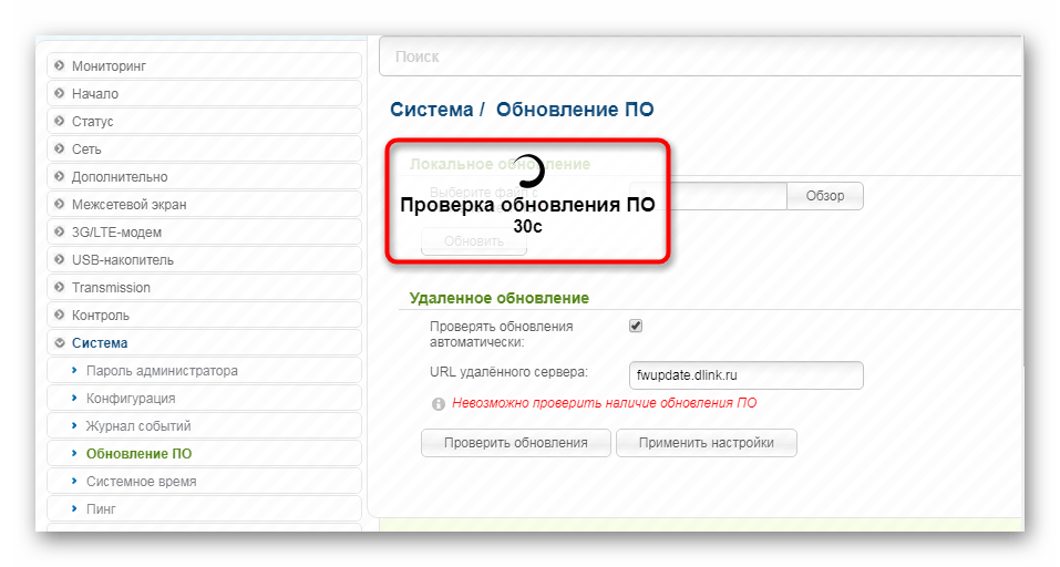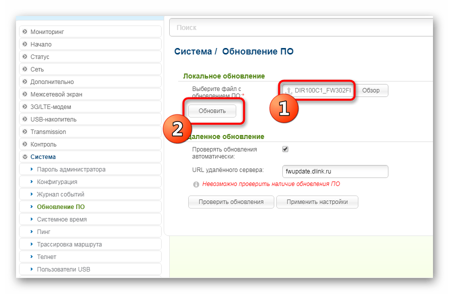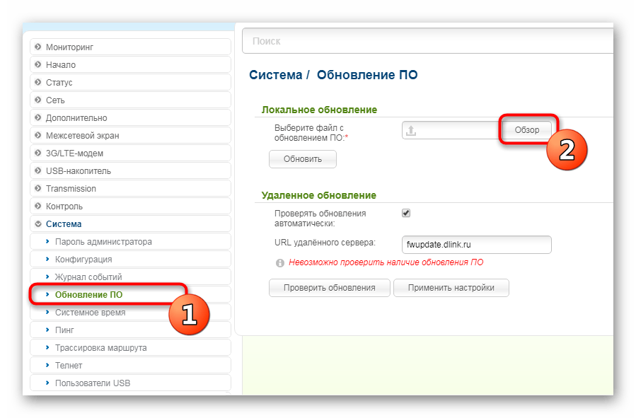 Откройте раздел веб-интерфейса с обновлением программного обеспечения по тому принципу, который вы видите в инструкции ко Способу 1. Здесь в «Локальное обновление» нажмите на «Обзор», чтобы перейти к выбору файла.