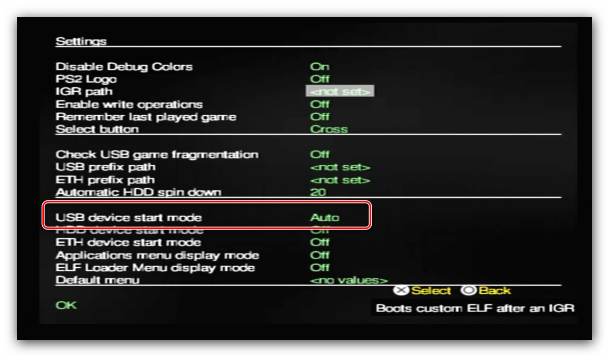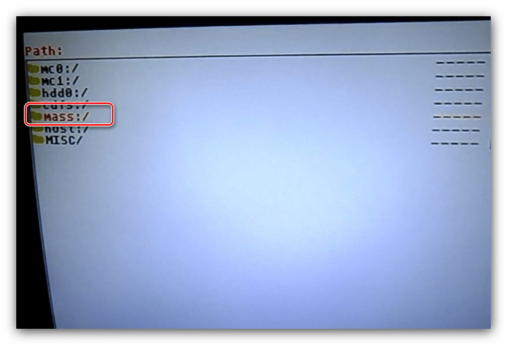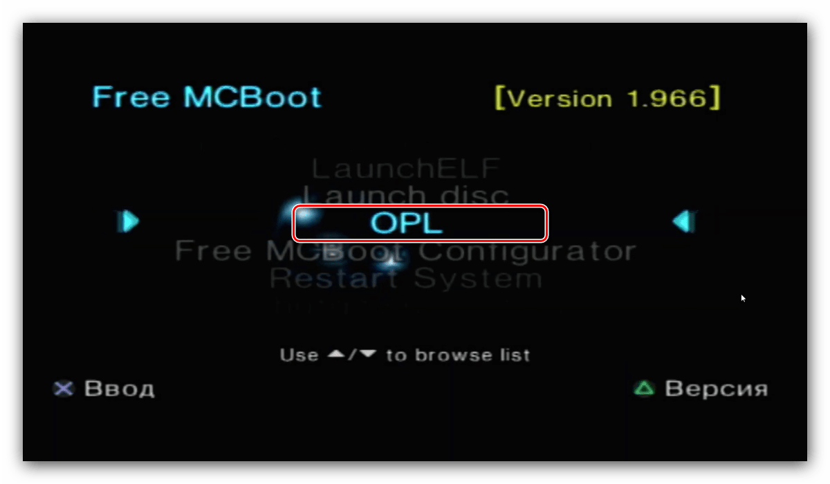 - Подключите накопитель к приставке, загрузите Free MCBoot и в его меню выберите пункт «OPL».