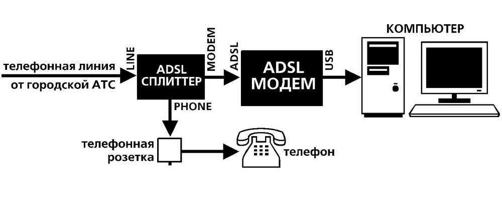 - От него один телефонный провод идет на сам городской телефон, а другой к ADSL модему.