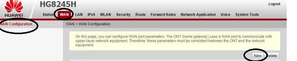 В меню WAN -> WAN Configuration нажимаем кнопку New:
