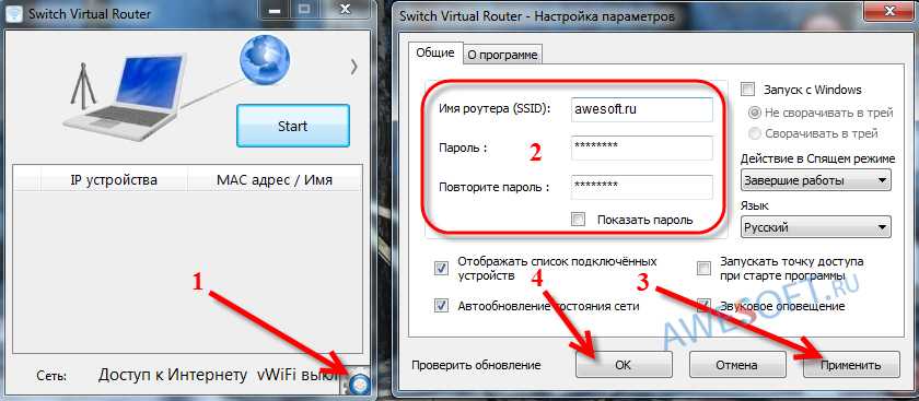 Появится страница настроек. Нам нужно задать только название нашей Wi-Fi сети, которую будет транслировать компьютер, и пароль.