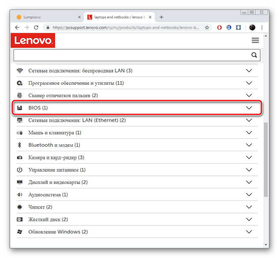 Среди списка драйверов и ПО отыщите раздел «BIOS» и нажмите на него, чтобы он раскрылся.