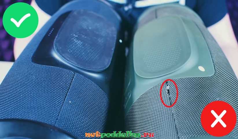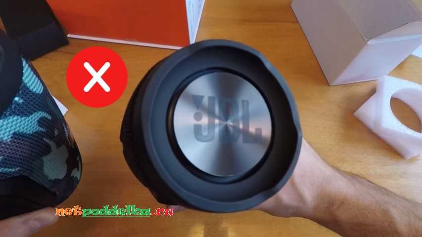 Для устойчивости портативной колонки используется подставка специальной формы. Мошенники часто копируют ее неправильно. В результате подделка обладает плохой устойчивостью и колонка опрокидывается от любого касания.