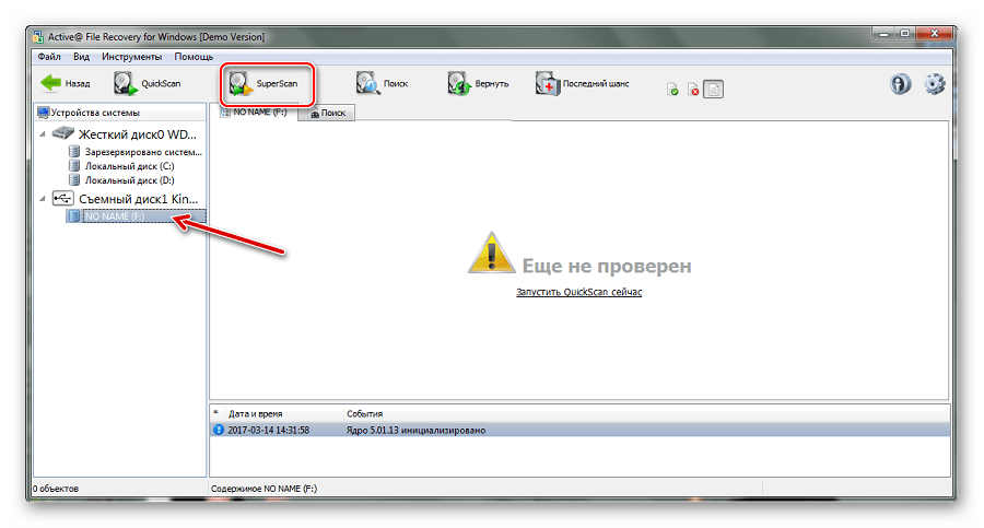 - Запустите программу. Слева выделите нужный носитель и нажмите «SuperScan».