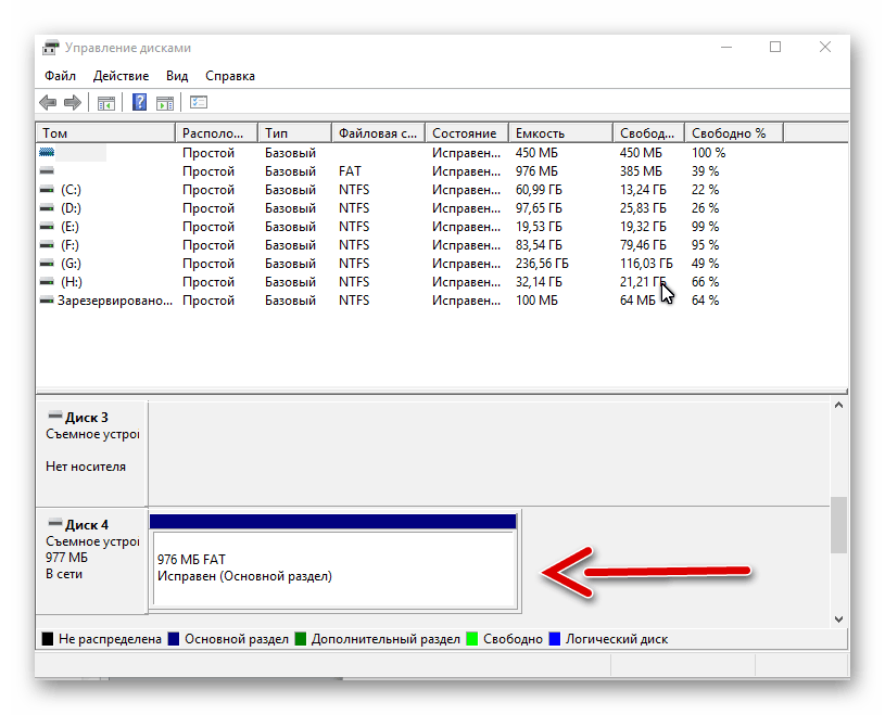 В нашем случае Диск 4 – Съёмное устройство, это и есть нерабочий USB-флеш накопитель. Так как, обычным способом с флешки нельзя восстановить данные и даже провести форматирование не получится, потому что она не определяется компьютером, или определяется как носитель с «0» объёмом памяти, нужно прибегнуть к восстановлению работоспособности USB флешки с помощью специальных утилит.
