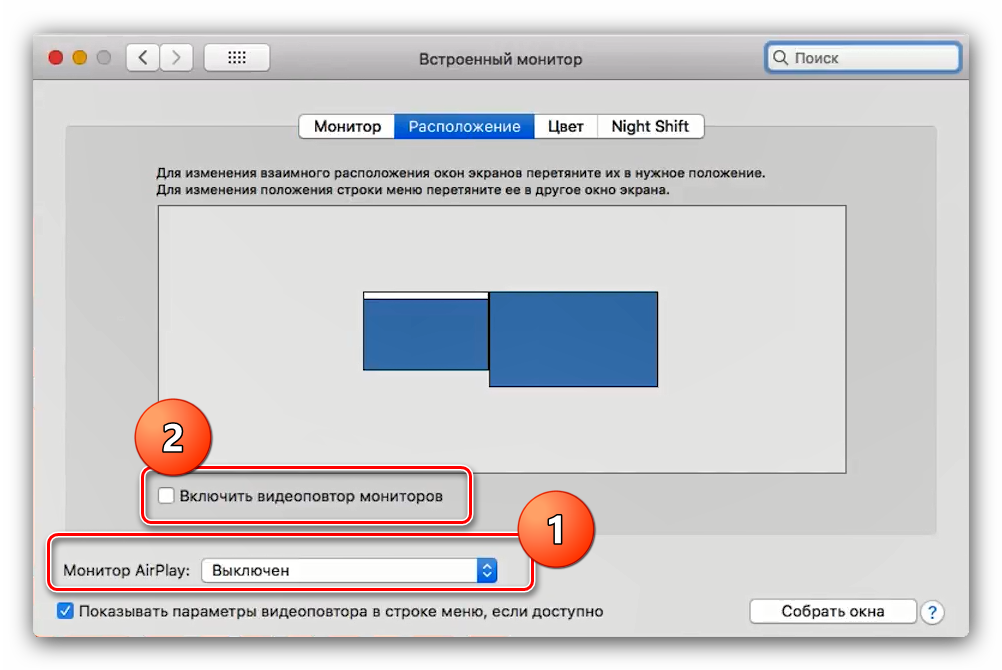 «Расширение» – телевизор используется просто как второй монитор: например, на встроенном экране МакБука можно открыть веб-браузер, а на телевизоре – видеоплеер или просмотрщик изображений. Эта опция активируется автоматически, если снять отметку с пункта «Включить видеоповтор…»;