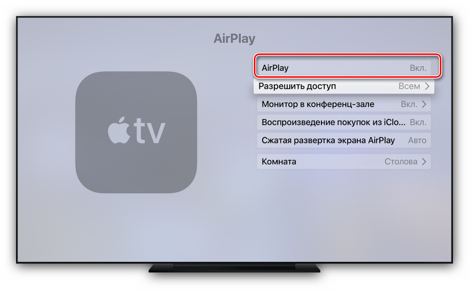 - Включите Apple TV, затем в меню программ выберите «Настройки» – «AirPlay» и убедитесь, что функция включена.