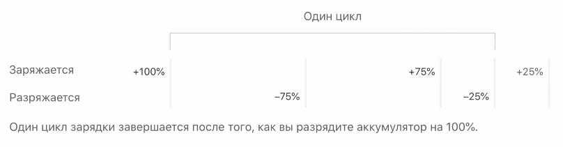 Износ батареи можно определить по циклам перезарядки. Один цикл — это полный разряд батареи до нуля и полный заряд до 100%.