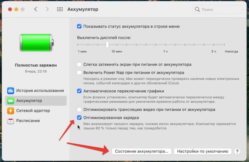 В MacOS Catalina и BigSur появились расширенные программные настройки батареи (Системные настройки — Аккумулятор). Обязательно в разделе «Состояние аккумулятора» активируйте пункт «Управлять сроком службы аккумулятора» и включите опцию «Оптимизированная зарядка».