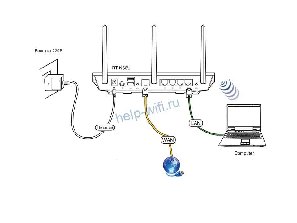 Теперь подключаем n66u и переходим к настройке. Определитесь с местом установки. Провода не должны быть натянуты, у каждого из них должен иметься запас. Это относится к сетевому кабелю, кабелю провайдера и проводу для подключения к компьютеру. Учитывая количество антенн и мощность сигнала, в квартире располагайте его в любом удобном месте. Если территория большая или сигнал через стены пробивается плохо, то нужно установить его примерно в центре необходимой зоны покрытия. При помощи антенн отрегулируйте направления усиления сигнала.