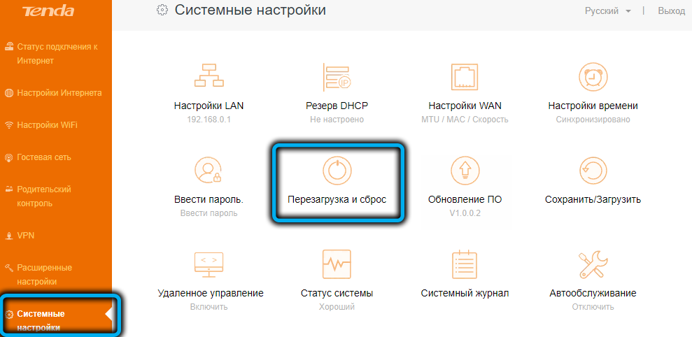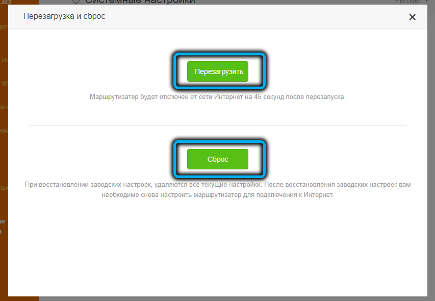 Если добрать до кнопки с ложно, ту же операцию можно выполнить через веб-интерфейс, зайдя во вкладку «Системные настройки» и выбрав пункт «Перезагрузка и сброс».