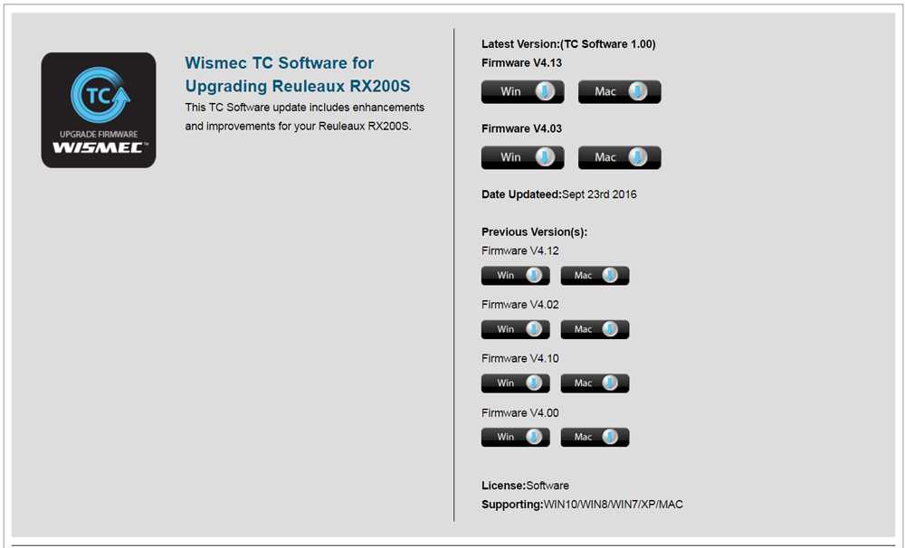 Если вышла новая Firmware (официальная), её можно смело качать. Устанавливают её с компьютера. Поэтому на сайте производителя есть два варианта программ — для Windows и для MacOS. Между ними нет принципиальной разницы при загрузке на Wismec Reuleaux RX200S. Просто установочные файлы адаптированы под разные операционные системы.