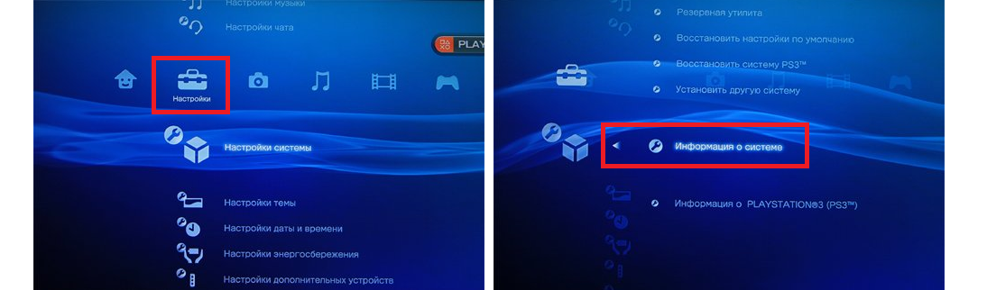 Рис. 1. Раздел «Настройки» в панели управления PlayStation3 и пункт «Информация о системе»