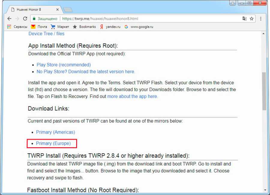 На открывшейся странице необходимо обнаружить «Downoload Links» и кликнуть на активную графу «Primary». Файл пользователь должен поместить туда же, куда помещена ADB.