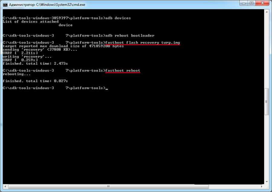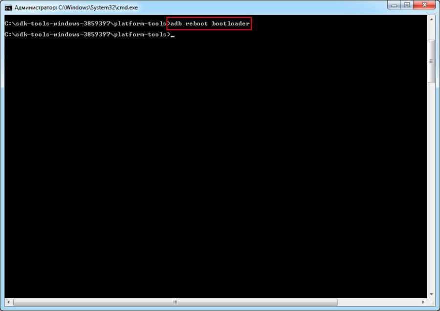 Снова возвращаемся к CMD и прописать adb reboot bootloader.