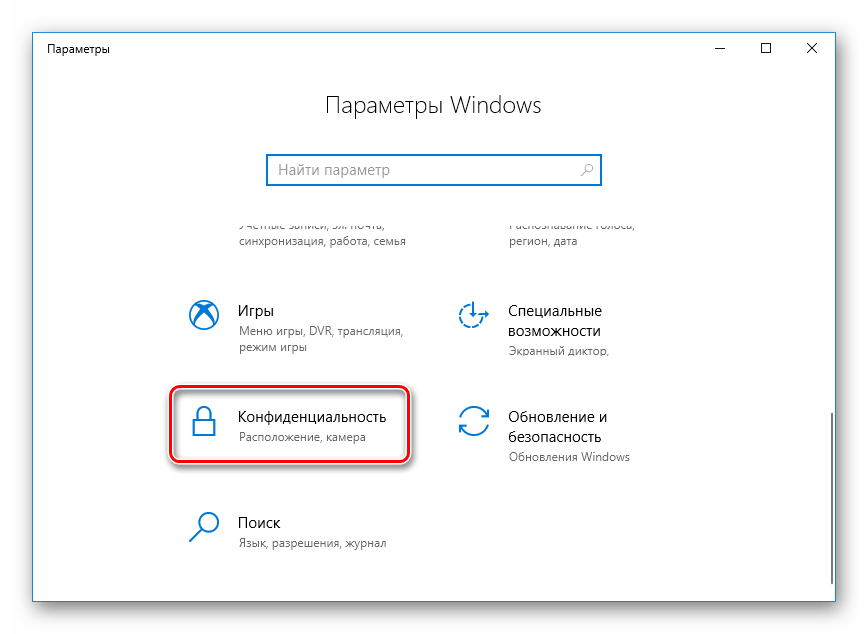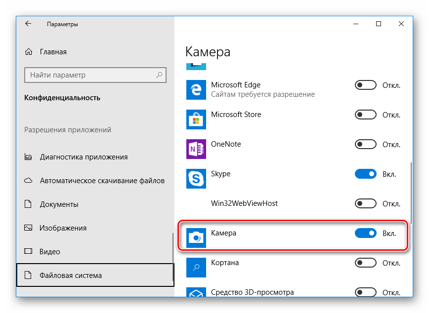 В «десятке» присутствует функция, отвечающая за конфиденциальность пользователя. С ее помощью блокируется доступ для ПО к камере и прочим данным. Для корректной проверки сперва требуется убедиться, что включено разрешение на использование рассматриваемого устройства. Проверить и настроить этот параметр можно следующим образом: