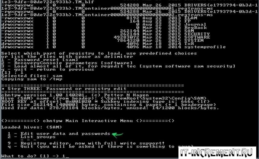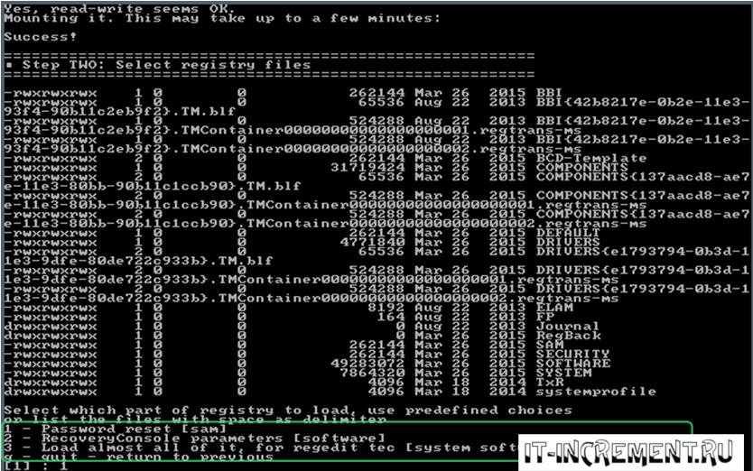Через некоторое время утилита выведет такие данные. Вам следует выбрать первый вариант, который как раз означает сброс пароля.