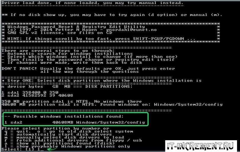 - Далее мы видим список разделов на жестких дисках, которые в данный момент подключены к системе. Обычно программа сама определяет, какой раздел требуется открыть, так как он содержит загрузочный сектор. Как видим, он у нас расположен под цифрой 1. Вводим соответствующее значение и снова жмем ENTER.