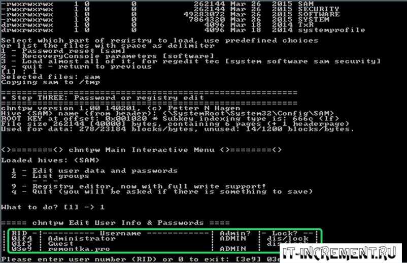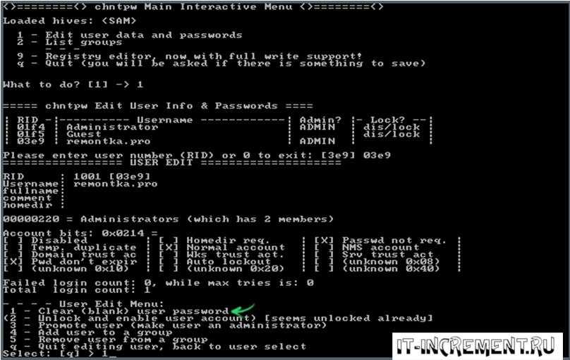 Далее, будет выведен список учетных записей, включая администратора. Все они имеют определенный номер, который вам следует ввести, чтобы система понимала для какой учетной записи необходимо сбросить password.