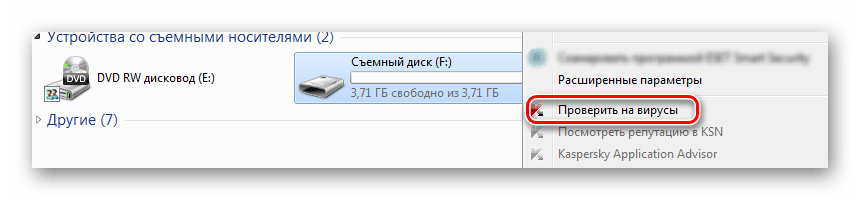 Также можно нажать правой кнопкой по флешке и выбрать «Проверить на вирусы».