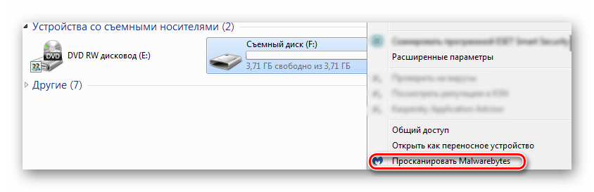 Можно пойти другим путем, просто кликнув правой кнопкой по флешке в «Компьютере» и выбрав «Просканировать Malwarebytes».