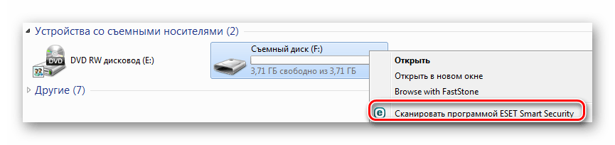 По завершении сканирования вы увидите сообщение о количестве найденных угроз и сможете выбрать дальнейшие действия. Просканировать носитель информации можно и через контекстное меню. Для этого нажмите по ней правой кнопкой и выберите «Сканировать программой ESET Smart Security».