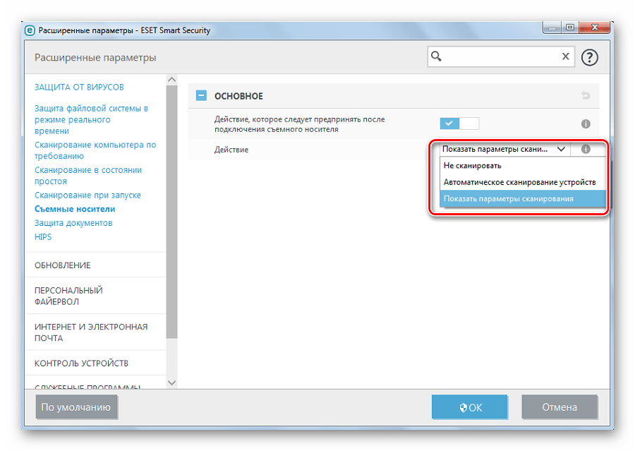Настройка / Дополнительные настройки / Защита от вирусов / Съемные носители
