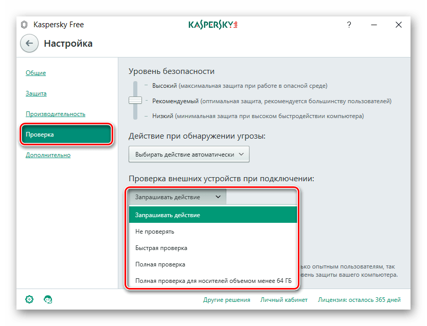 Не забудьте настроить автоматическое сканирование. Для этого перейдите в настройки и нажмите «Проверка». Здесь можно задать действие антивируса при подключении флешки к ПК.