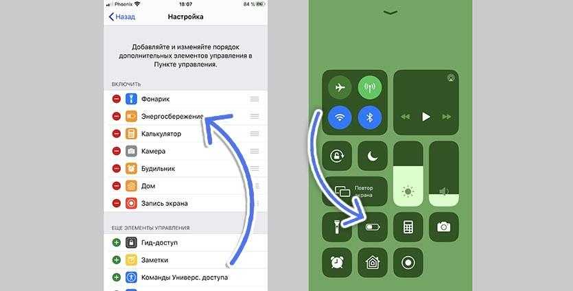 - Для этого заходите в «Настройки» и находите в списке «Пункт управления». Кликаете по данной вкладке и нажимаете «Настроить», после чего добавляете в список «Режим энергосбережения». Только после этой процедуры он будет доступен вам быстрым свайпом.