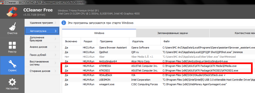 После установки драйвера желательно проверить, добавлен ли он в автозагрузку. Удобней всего для этого использовать C&Cleaner (бесплатная утилита для комплексного обслуживания системы). После запуска программы необходимо перейти во вкладку «Сервис», далее выбрать пункт «Автозагрузка».