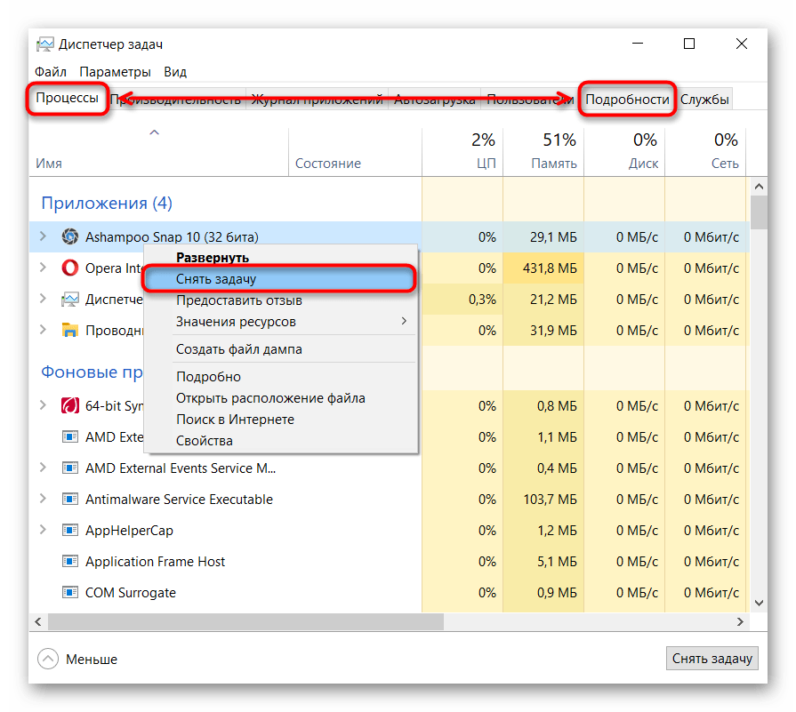 Если зависла какая-то программа, выключать ноутбук не обязательно, можно просто принудительно выгрузить виновника ситуации. Для этого на вкладке «Подробности» или «Процессы» (в зависимости от версии Windows) найдите зависшее приложение, кликните по нему правой кнопкой мыши и выберите пункт «Снять задачу» (так же может помочь пункт «Завершить дерево процессов», что есть только на вкладке «Подробности»).