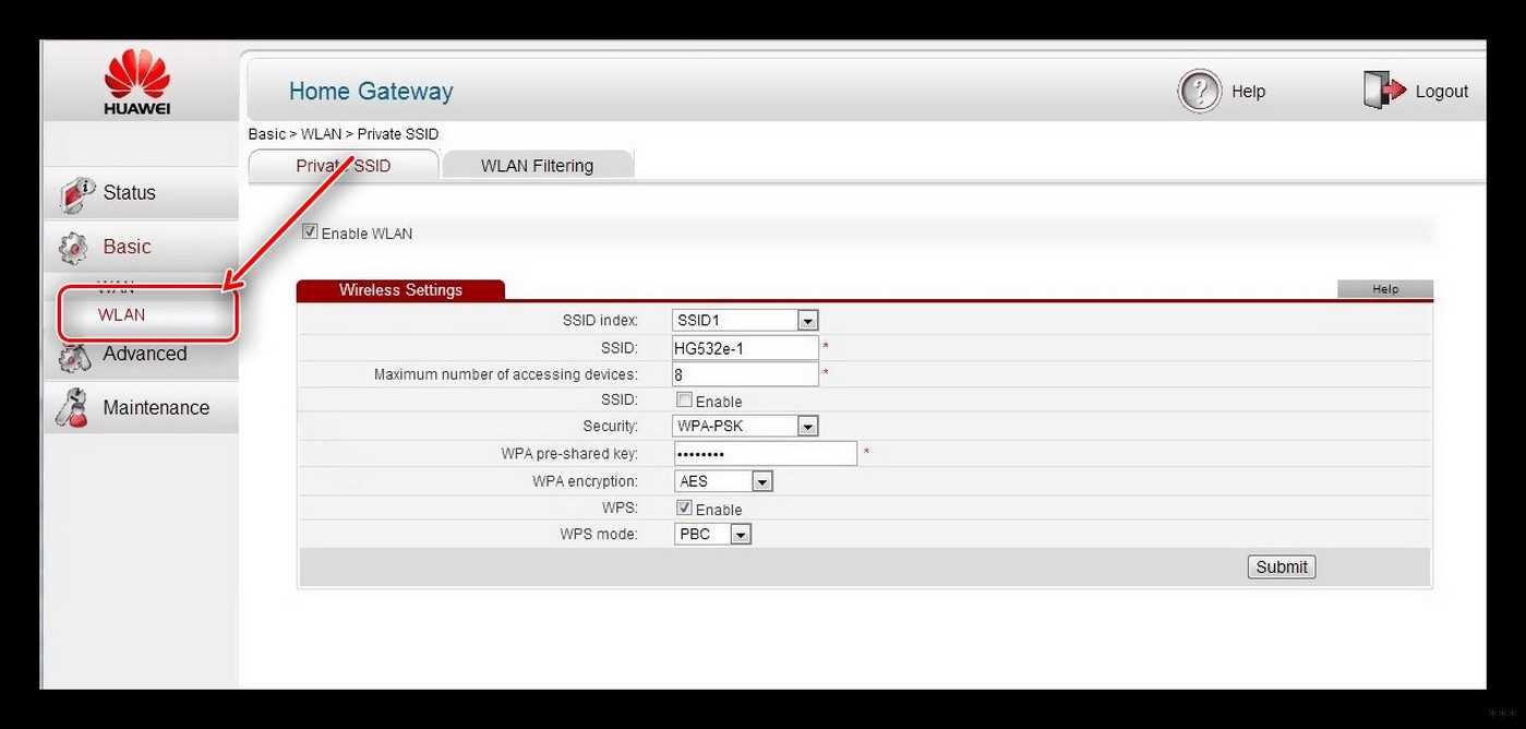 - Теперь для настройки Wi-Fi, переходим в «WLAN». Имя сети можно поменять в строке «SSID», а пароль в «WPA preshared key», если у вас строит «Security» как «WPA-PSK».