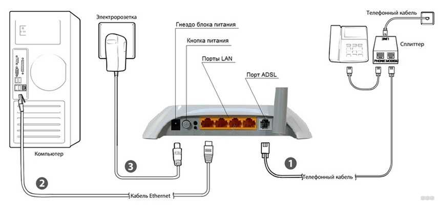Покажу на примере маршрутизатора TP-Link. Сначала подключаем его в розетку. Далее в единственный aDSL порт подключаем телефонный кабель от сплиттера или из подъезда. Далее я буду для настройки использовать подключение напрямую. Я просто подключу компьютер к одному из LAN портов желтого цвета. Туда же можно подключить ноутбук, телевизор, камеру видеонаблюдения или принтер.