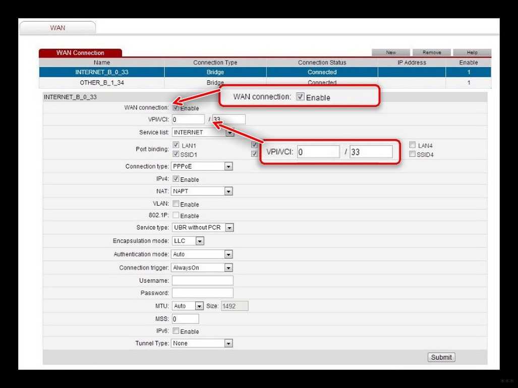 - «BASIC» – «WAN». Теперь кликаем первое подключение и включаем галочку «WAN connection». Далее нужно будет ввести дополнительные данные из договора: VPI, VCI. Также на забываем указать «Connection type» – от этого будет зависеть дополнительные данные, которые нужно списать с договора.