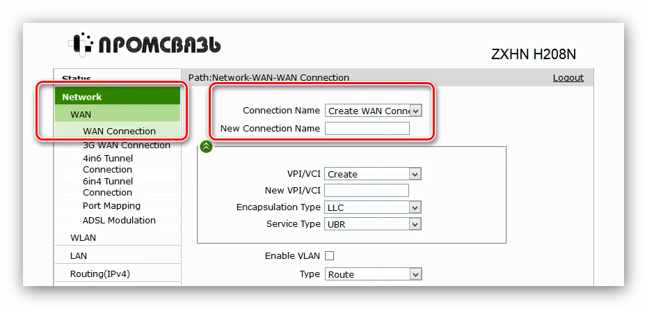 - Откройте последовательно разделы «Network» — «WAN» — «WAN Connection». Выберите опцию «Create WAN Connection».