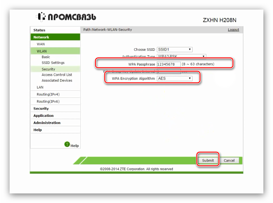 Далее переходите к подпункту «Security». Здесь понадобится выбрать тип защиты и установить пароль. Варианты защиты размещены в выпадающем меню «Authentication Type» — рекомендуем остановиться на «WPA2-PSK». Пароль для подключения к вай-фаю задается в поле «WPA Passphrase». Минимальное число знаков равно 8, но рекомендуется использовать не меньше 12 разнородных символов из латинского алфавита. Если придумать подходящую комбинацию для вас трудно, можете воспользоваться генератор паролей на нашем сайте. Шифрование оставьте как «AES», после чего нажмите «Submit» для окончания настройки.