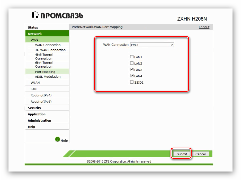 Далее понадобится пробросить порт для подключения кабеля или приставки. Переходите к вкладке «Port Mapping» раздела «WAN Connection». По умолчанию открыто основное подключение под именем «PVC0» — внимательно взгляните на отмеченные под ним порты. Скорее всего, один или два разъёма будут неактивны – их мы и пробросим для IPTV. Выберите в выпадающем перечне созданное ранее соединение «PVC1». Отметьте под ним один из свободных портов и жмите «Submit» для применения параметров.